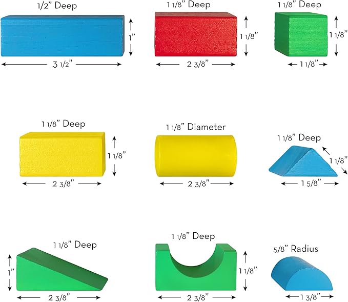 - Colorful Wooden Blocks Set: Includes 100 lightweight, yet durable, solid wood blocks in 4 colors and 9 classic shapes; pieces store neatly in the included sturdy cardboard toy box with carrying handle