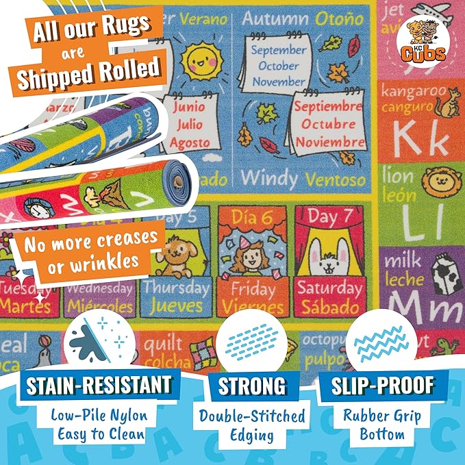 KC Cubs 5x7 ABC Alphabet, Seasons, Months & Days Rug – Educational Play Mat Carpet for Kids, Toddlers, Nursery, Classroom, Playroom, Baby Daycare