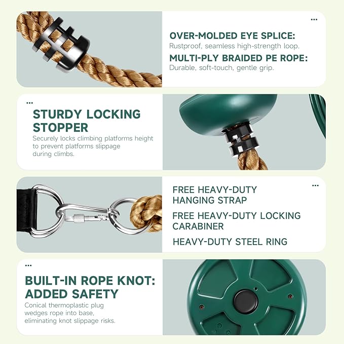 - 【UPGRADED DESIGN】- Made of Heavy duty materials, a stronger, durable design and 220lb weight capacity ensure this kid climbing rope swing will last you and your family for years.Add it to your current swing set, use it as a tree climbing rope, climbing rope ladder or a rope swing.