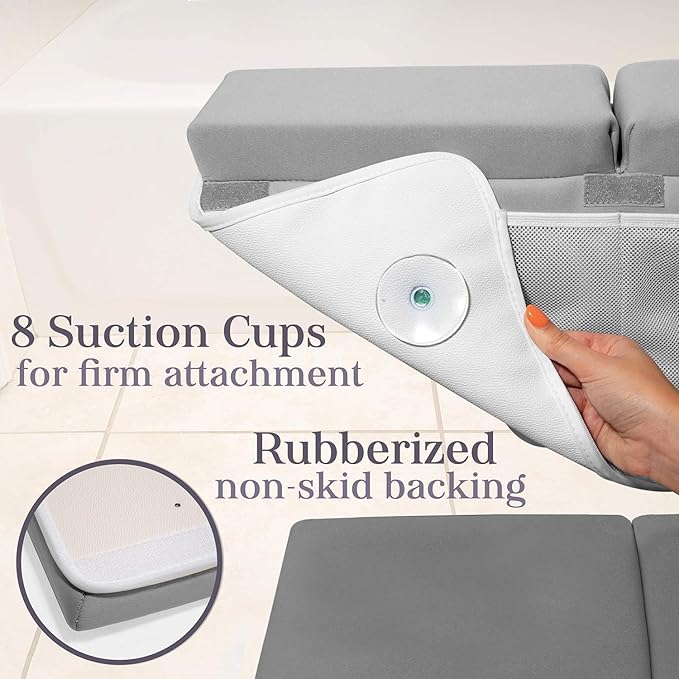 - NON-SLIP DESIGN BABY SAFETY PRODUCTS: With our grey bath knee pad and elbow rest combination, you won't have to worry about slipping and falling while taking a bath anymore. Kneeling pad is waterproof, matte, and incredibly durable makes it non-slip. The non-slip rubber bottoms of the baby bath set keeps the baby bath kneeler firmly in place. Six powerful suction cups on the elbow rest pad keep it firmly attached to the baby bathtub and prevent it from slipping.