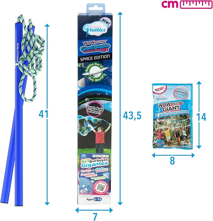 - COMPLETE KIT: The kit contains everything you need to create bubbles that are big, colorful, and fun: a set of giant bubble maker, 2 pouches of WOWmazing Bubble Concentrate, a Tip & Tricks booklet to help you become a master bubble creator, and 8 Glow-in-the-Dark stickers making jumbo bubbles out of this world!