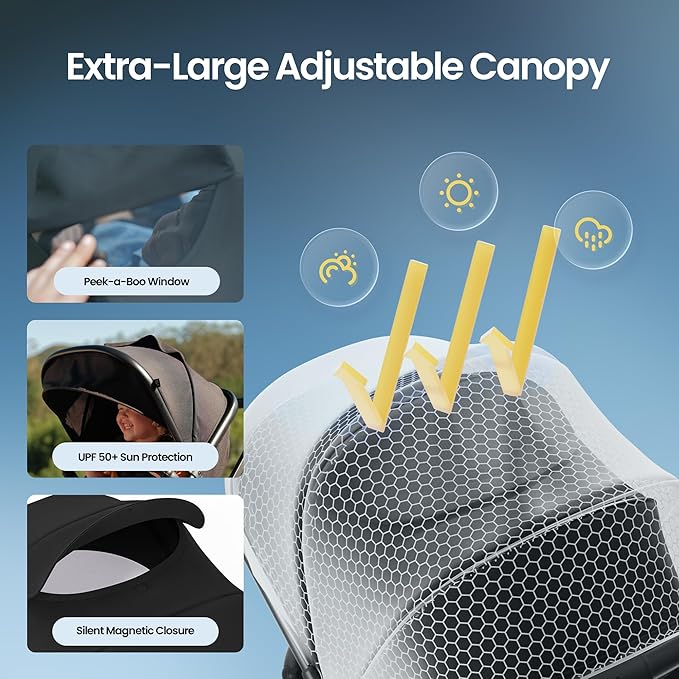 - Silent Comfort & Full Protection: A zip-out UPF 50+ canopy provides full sun protection, while the top ventilation window uses a magnetic silent latch, allowing quiet operation so your baby stays undisturbed during naps. Includes a cup holder, foot cover, rain cover, and car seat adapter for a complete travel system.