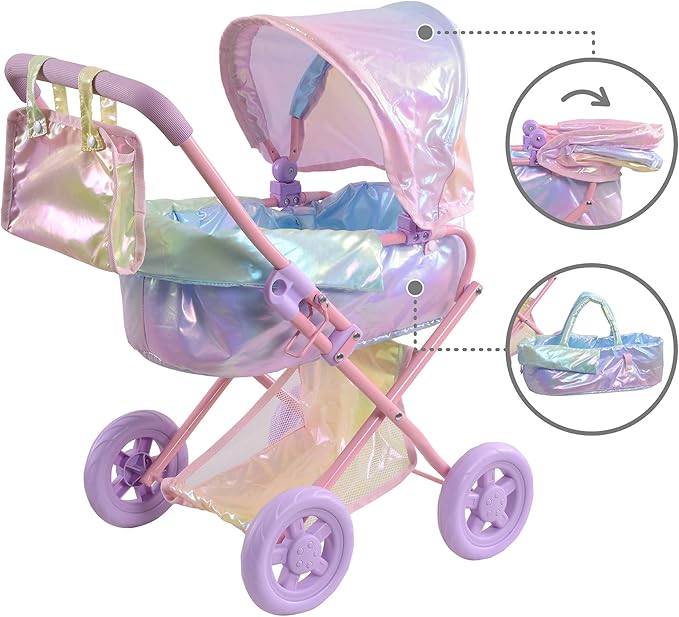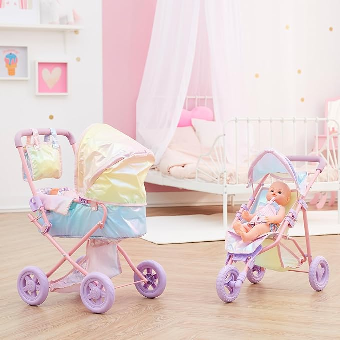 - 2️⃣COLORFUL SHIMMER: The overall iridescent rainbow fabric sparkles beautifully in the light, making this fabulous baby doll stroller set your little one's new favorite!