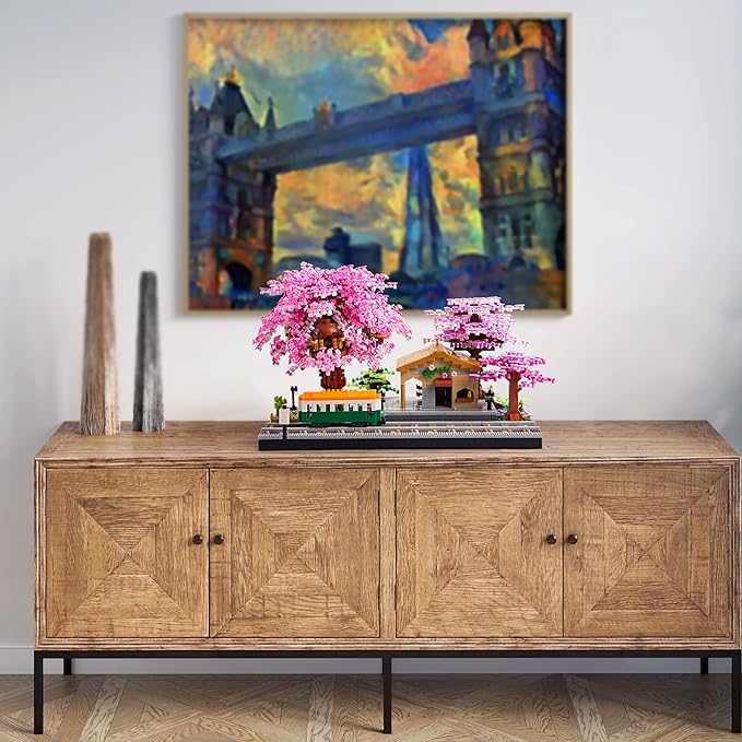 Architecture, Japanese Sakura Tree Class Train Station Cherry Blossom Tree Building Block Model Kit 3668 PCS for Adults and Kids, Classical Building Micro Blocks Set,Mini DIY Assembly Toy