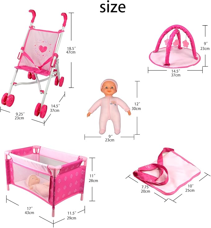ANIVIA Baby Doll Stroller Set - Includes Stroller, Crib, Play Mat, Feeding Toy, Diaper Bag - Nursery Role Play Set (11" Doll Included)