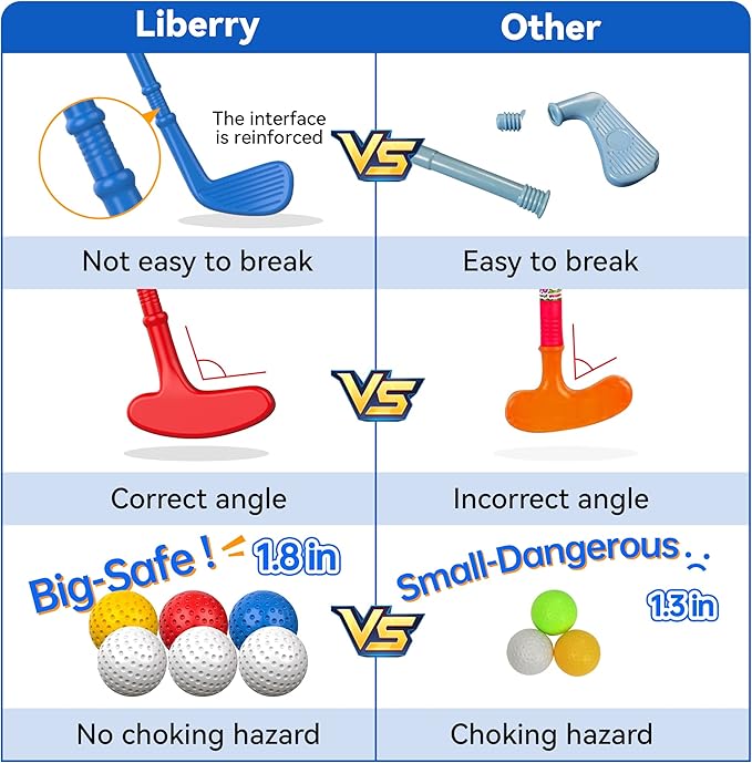 - SAFE AND DURABLE: The latest version of Liberry kids golf set is produced with odorless and high-quality plastic. The toddler golf set does not include any parts or edges that are jagged or pointed. The hardness of the club is enhanced, and it is not easy to break. Because our golf balls are larger (1.8 inches in diameter), it can effectively avoid choking hazards