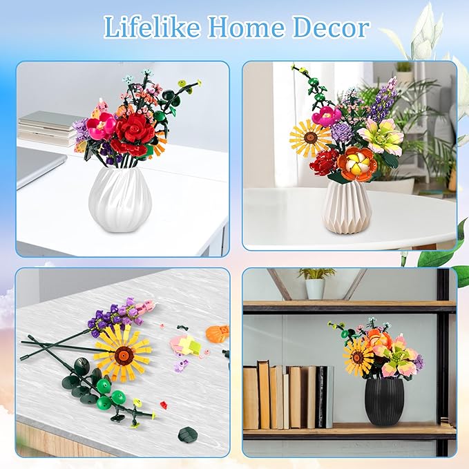 - Aesthetic Delight: Enhance your home or office space with the exquisite beauty of our bouquet building block set (vases not included). These timeless flowers add warmth and elegance to any environment, transforming mundane moments into extraordinary ones. No need to worry about wilting; these blooms remain vibrant