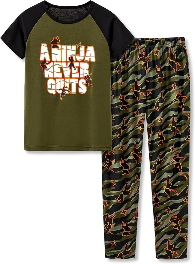 - Feature: This boys' loungewear features the ninja graphics and the positive slogan of " A ninja never quits ", making this an extra fun and beloved casual clothes set for boys at bed time. Crewneck & raglan sleeves on top. Pull-on elasticized waistband on the PJ pants for on-and-off convenience. This nighty with black and olive green contrast colors will make the boys stand out on Pajama Day or slumber party.