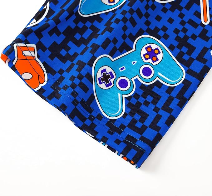 - Feature: This boys' loungewear features the game controller, basketball, and soccer graphics, with text of " EAT SLEEP GAME RESTART " in pixel style, making this an extra on-trend and beloved casual clothes set for boys at bed time. Crewneck & raglan sleeves on top. Pull-on elasticized waistband on the PJ pants for on-and-off convenience. This nighty with dark blue and light blue contrast colors will make the boys stand out on Pajama Day or slumber party.