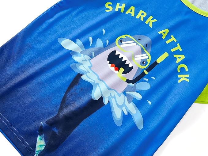 - Feature: This boys' loungewear features the snorkeling shark graphic and the text of " SHARK ATTACK " on green and blue background colors, with all-over shark and text print on the pajama pants, making this an extra fun and beloved casual clothes set for boys at bed time. Crewneck & raglan short sleeves on top. Pull-on elasticized waistband on the PJ pants for on-and-off convenience. This nighty with blue and gray contrast colors will make the boys stand out on Pajama Day or slumber party.