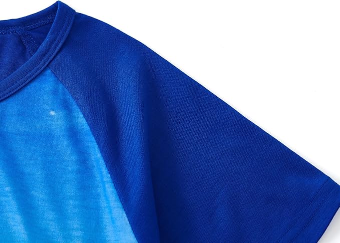 - Feature: This boys' loungewear features the swim ring dino and coconut palm graphic with the text of " NO WAVES NO FUN " on the blue top, all-over the coconut palm print on the light blue pajama pants, making this an extra fun and beloved casual clothes set for boys at bed time. Crewneck & raglan short sleeves on top. Pull-on elasticized waistband on the PJ pants for on-and-off convenience. The interesting patterns will make the boys stand out on Pajama Day or slumber party.