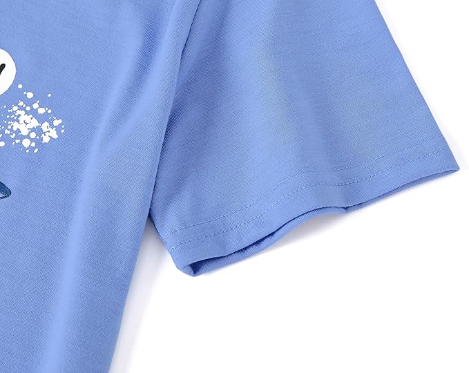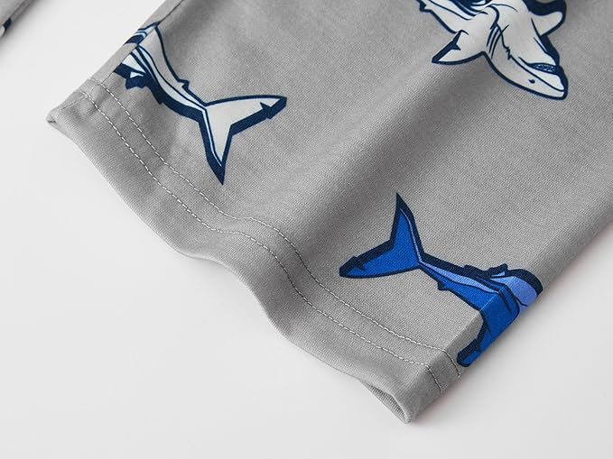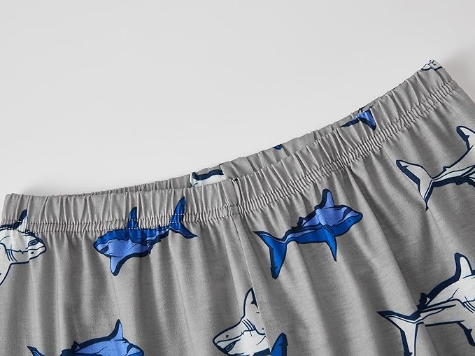 - Feature: This boys' loungewear features the blue & white shark graphic and interesting text at front on the blue top, with all-over blue & white shark print on the gray pajama pants, making this an extra fun and beloved casual clothes set for boys at bed time. Crewneck & raglan short sleeves on top. Pull-on elasticized waistband on the PJ pants for on-and-off convenience. This nighty with blue and gray contrast colors will make the boys stand out on Pajama Day or slumber party.