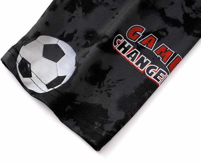 - Feature: This boys' loungewear features the basketball graphics with the cool text of " GAME CHANGER " on the black top front. All over basketball, football and other ball patterns with text of " GAME CHANGER " on the pajama matching pants. Making this an extra fun and beloved casual clothes set for boys at bed time, also make the boys stand out on Pajama Day or slumber party. Crewneck short sleeves on top. Pull-on elasticized waistband on the PJ pants for on-and-off convenience.