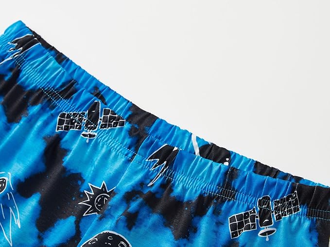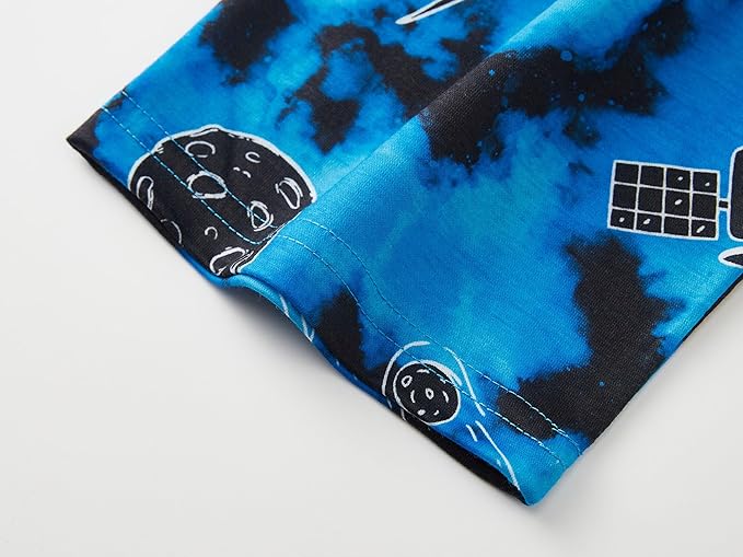 - Feature: This boys' loungewear features the blue & white astronaut and cosmic planet graphics with blue text of " FAR OUT " at black top front. All over the black planet and satellite in the universe print pattern on the blue tie dye pants. Making this an extra fun and beloved casual clothes set for boys at bed time, also make the boys stand out on Pajama Day or slumber party. Crewneck short sleeves on top. Pull-on elasticized waistband on the PJ pants for on-and-off convenience.