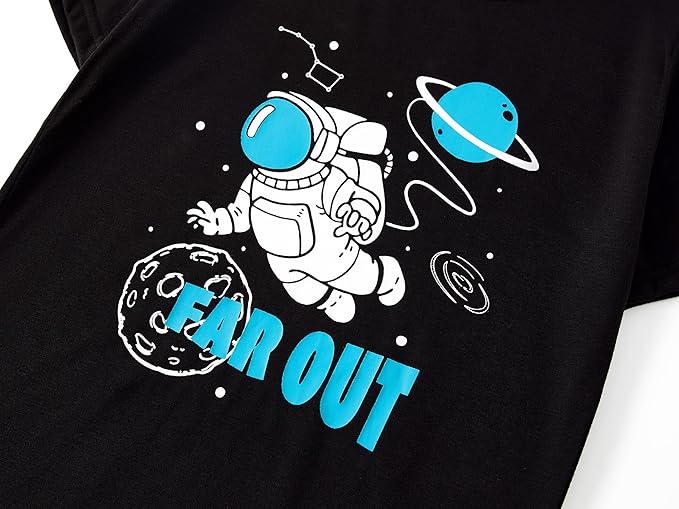 - Feature: This boys' loungewear features the blue & white astronaut and cosmic planet graphics with blue text of " FAR OUT " at black top front. All over the black planet and satellite in the universe print pattern on the blue tie dye pants. Making this an extra fun and beloved casual clothes set for boys at bed time, also make the boys stand out on Pajama Day or slumber party. Crewneck short sleeves on top. Pull-on elasticized waistband on the PJ pants for on-and-off convenience.