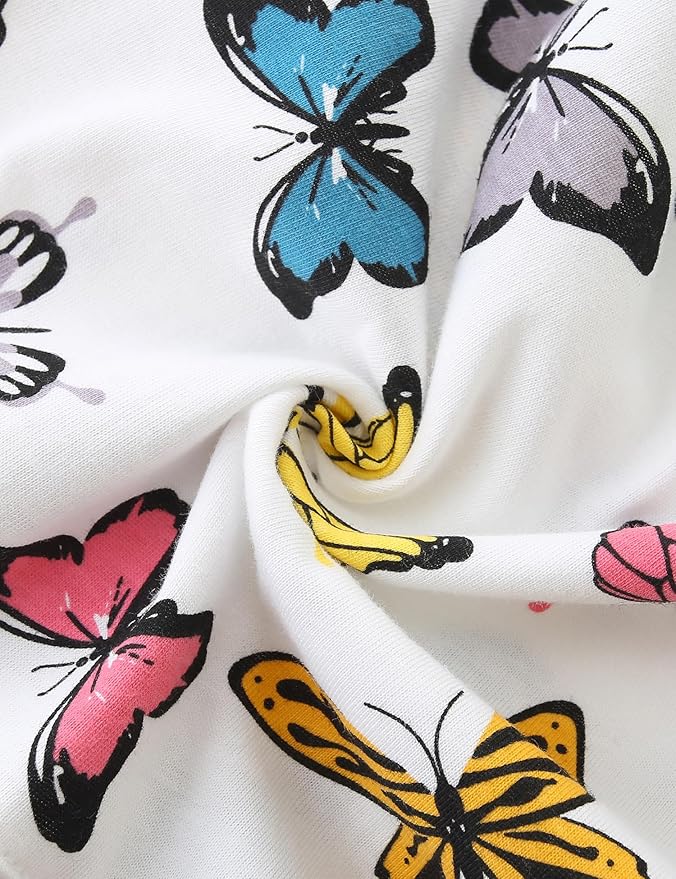 - Featuring a delightful butterfly print on a white base,this dress adds a fun and whimsical touch to any girl's wardrobe.The long sleeves and gathered waist create a flattering silhouette that is both stylish and comfortable.