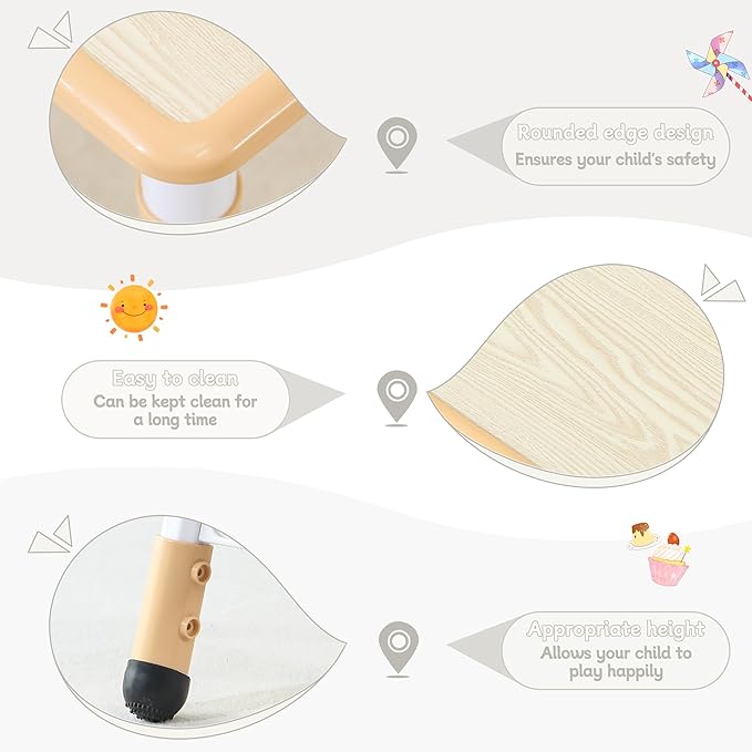 - High Safety: The toddler chairs have been specially treated to be smooth and rounded with no sharp edges, ensuring safety during playtime. The table can support up to 300 pounds, and the chair can support up to 180 pounds.
