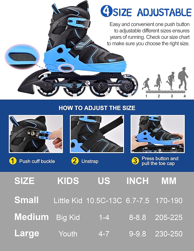 - 【ADJUSTABLE INLINE SKATES】Our inline skates have 3 different Unisex size , S/M/L, and each size is adjustable to to adapt to the growth of young people and accompany them for a long time.The adjustment process is simple, just press and hold the button to pull or push the skates toe to the fit size within some range,without much effort.
