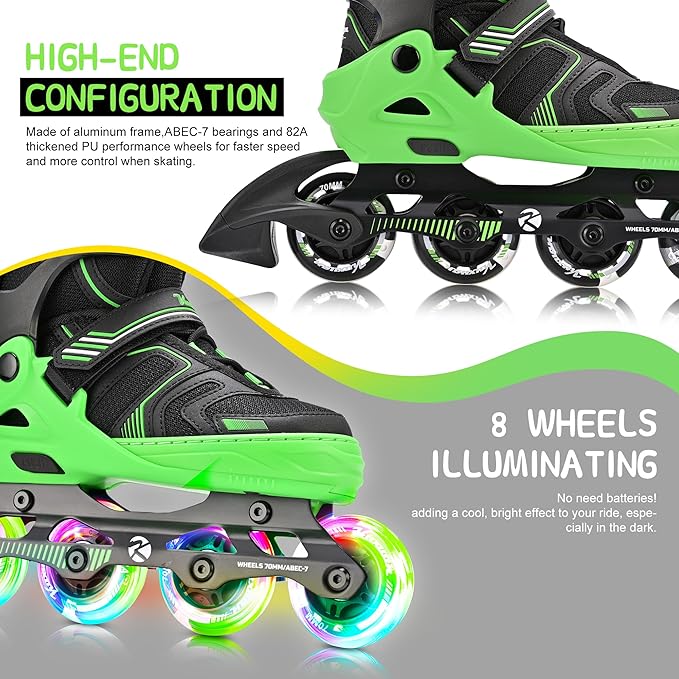 - 【8 WHEELS ILLUMINATING】Equipped with eight illuminating wheels, our inline skates light up automatically as you skate.Powered by the rolling motion, these lights do not require batteries, adding a cool, bright effect to your ride, especially in the dark.
