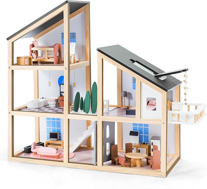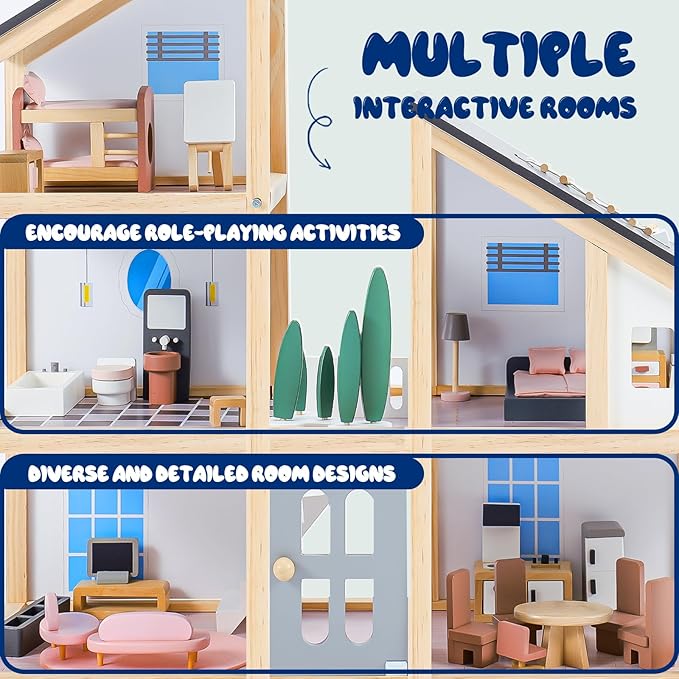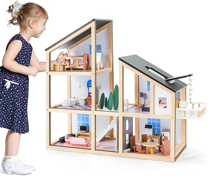 Large Wooden Doll House for Kids Ages 3+, Sturdy Modern Family Dollhouse Kit with Realistic Furniture Design, Educational Wooden Toy House for Toddlers Early Learning & Creative Play