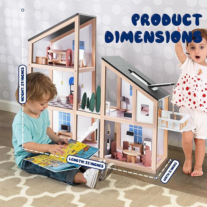 - Non-toxic, Odorless, Eco-friendly Material: Crafted from premium wood, JoyLike Dollhouse ensures your child’s safety with its non-toxic, odor-free materials. Its smooth finish without any sharp edges makes it safe for toddlers to explore and enjoy. Product Specification - L: 33inch, W: 12inch, H: 29inch
