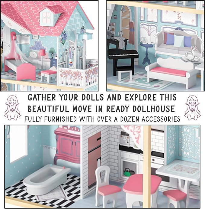 - A KID’S DOLLHOUSE DREAMS COME TRUE | Discover a Multi-Story Mansion Beyond Your Child’s Wildest Imagination! | This Magnificent 4’ Wooden Dollhouse Provides Tots with a Life-Size Domestic Diorama Featuring 3 Floors, Multiple Rooms, a Built-In Elevator, Balcony & 12-Piece Accessories Set