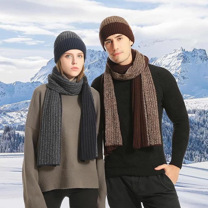 Men's Winter Hat Scarf Gloves Set, 3 PCS Warm Beanie Long Scarf Fleece Lined Touchscreen Gloves for Cold Weather