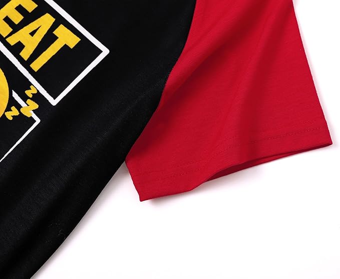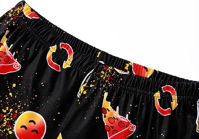 - Feature: This boys' loungewear features " Eat , Sleep & Game " and all over prints of cute pizza, sleeping face, game controls on pants, making this an extra trendy and beloved casual clothes set for boys at bed time. Crewneck & raglan short sleeves on top. Pull-on elasticized waist on the PJ pants for on-and-off convenience. The vibrant contrast of yellow and black colors in this nighty ensures that the boys will stand out at Pajama Day or any slumber party.