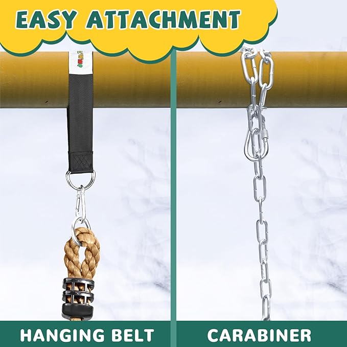 - 【SETUP IN MINUTES】- Simply use the carabiners or hanging belt to attach these kid’s swings to any swing set, robust trees, play set, ceiling or sturdy beams for quick assembly. If there is any defect with these kid’s swings, please contact us for replacement ASAP.