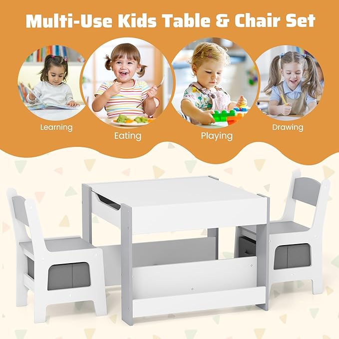 - Versatile 4-in-1 Design: This kids table and chairs set has a detachable and reversible tabletop and various storage options. One side of the tabletop boasts a blackboard for drawing and creativity, while the other offers a whiteboard ideal for drawing, reading, eating, playing, or crafting activities. After drawing on the whiteboard with a water-based pen, it can be easily wiped clean with a damp cloth.