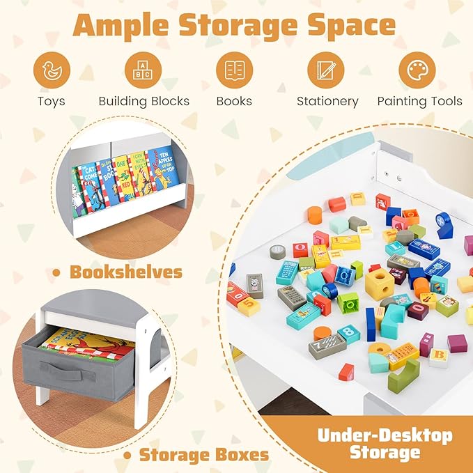 Costzon Kids Table and Chairs, 4 in 1 Wooden Activity Desk Set w/Reversible Tabletop, Bookshelves & Storage Drawers for Drawing, Reading, Crafts, Playing, Toddler Table and Chair Set (Gray)