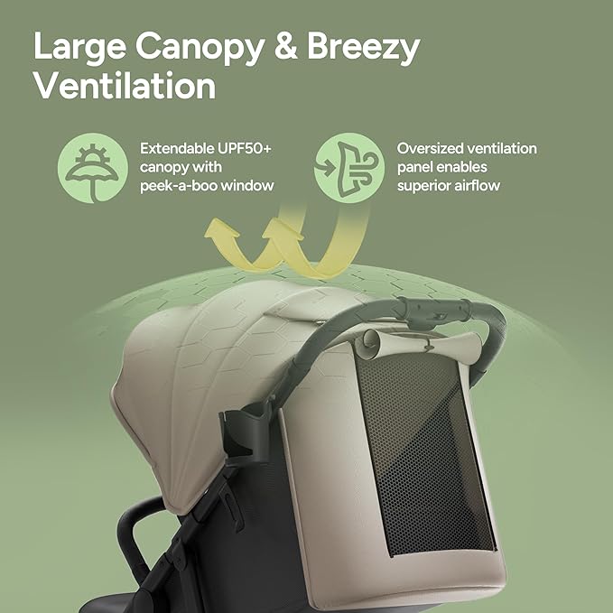 - Large Canopy & Breezy Ventilation - Enjoy total protection with an extra-large UPF 50+ sun canopy. For warmer climates, the backrest intelligently transforms into an extra-large ventilation panel, providing both a panoramic view and superior airflow. This system, complemented by a silent magnetic peek-a-boo window, ensures your child remains cool and comfortable while staying connected to you and their surroundings. From scorching sun to a gentle breeze, your baby travels in protected comfort.