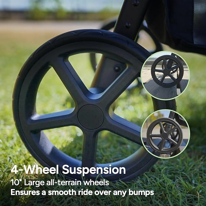 - Smooth All-Terrain Ride with All-wheel Suspension - Engineered with large, 10-inch all-terrain wheels and an advanced 4-wheel suspension system, this newborn stroller effortlessly and absorbs every bump in its path. From cobblestone streets to park trails, it ensures a consistently smooth and serene ride, protecting your sleeping baby from any disturbance.The rear-linked foot brake secures the stroller with a simple tap.