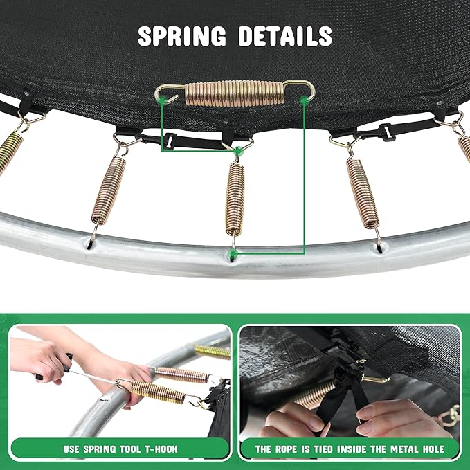 - 【Strong Security】The outdoor trampoline is equipped with a 360 ° safety enclosure net and 8 safety bending bars, which surround and support the entire jumping area in all directions. The gap between the safety bending rod and the safety net, which bring safe and flexible distance. It is prevent children from falling during play. Each safety bending rod is equipped with thickened foam, which eliminates the pain of collision