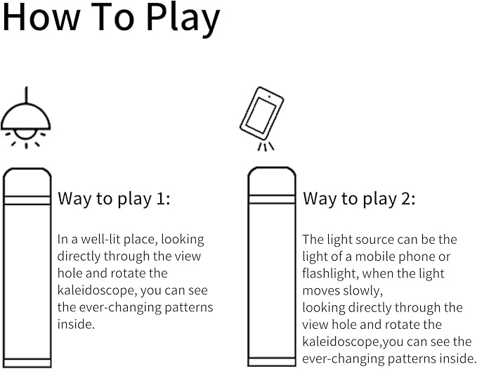 - How to play: Please remove the transparent protective film at the 2 ends of kaleidoscope, point the kaleidoscope’s core box towards a well-lit area or aim at flashlight, and rotate the core box or the entire kaleidoscope, you will see the colorful and ever-changing world. By the way, the teardrop viewing hole will make larger visual range than circular viewing hole.