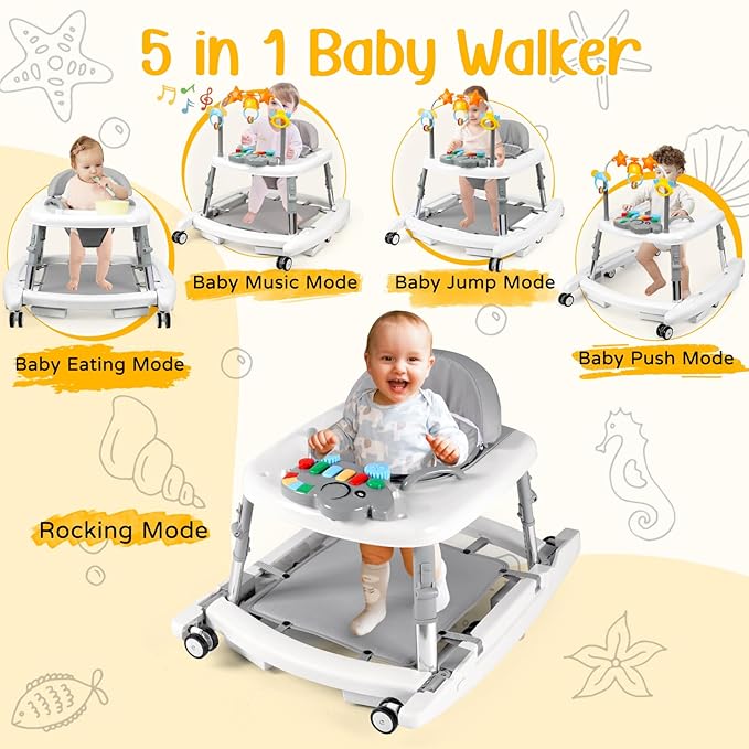 - [5-in-1 Baby Walker Design] : The baby walker has five modes: baby walker mode, bouncing combination mode, rocking chair mode, dining table mode, and hand push mode. Baby walkers meet the exploration and growth needs of infants at various stages from 6 months to 18 months, and do not require complicated installation steps. Moreover, in the pushing mode of the baby walker, the directional wheels can be used, which can increase or decrease the movement speed of the wheels.