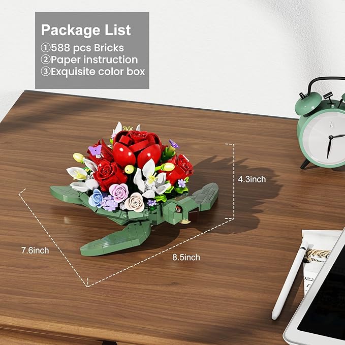 - Creative decoration display model: Once completed, this turtle rose flowerpot building block model will become an eye-catching decorative item, suitable for home decoration anywhere in the home or office, whether you place it on the balcony, courtyard, yard, lawn , even the wide window sill will leave a deep impression