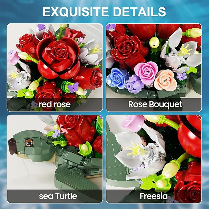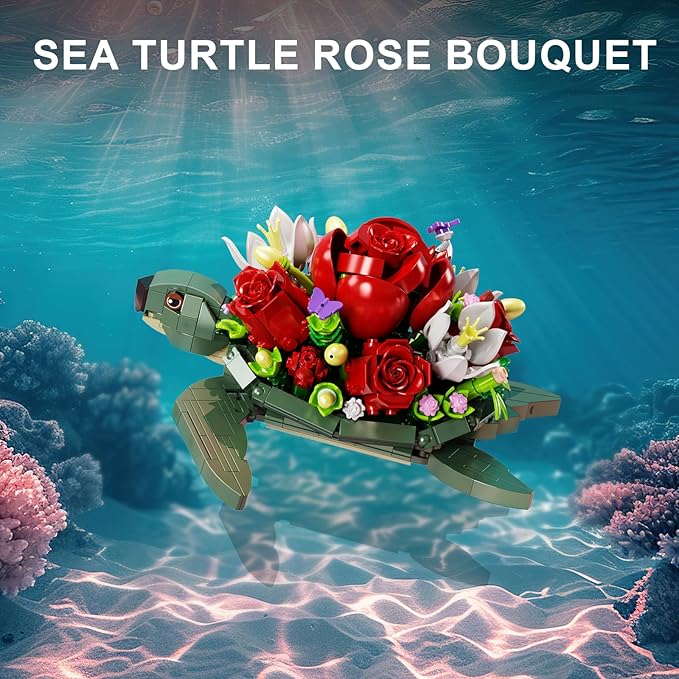 Sea Turtle Rose Bouquet Succulent Planter Building Set, Compatible with Lego Flowers Plants Pot, Creative Plants and Animals Home Decoration Blocks Toy, Gifts for 6+ Girls, Women (588PCS)