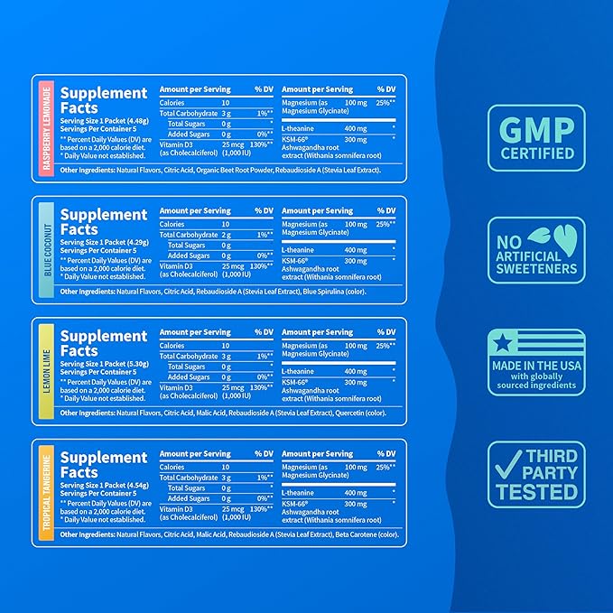Nello Supercalm Drink Mix - Ashwagandha KSM 66, Magnesium Glycinate & L-Theanine Supplement, Vitamin D3 - Ashwagandha Root Extract - Focus and Relaxation Support (20 Travel Packets) - Variety Pack